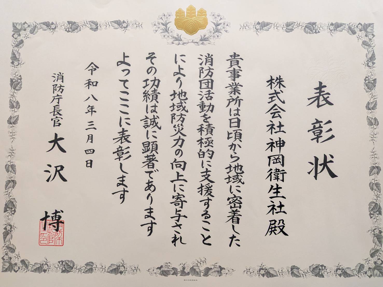 令和7年度防災功労者消防庁長官表彰及び消防団等地域活動表彰を頂きました。